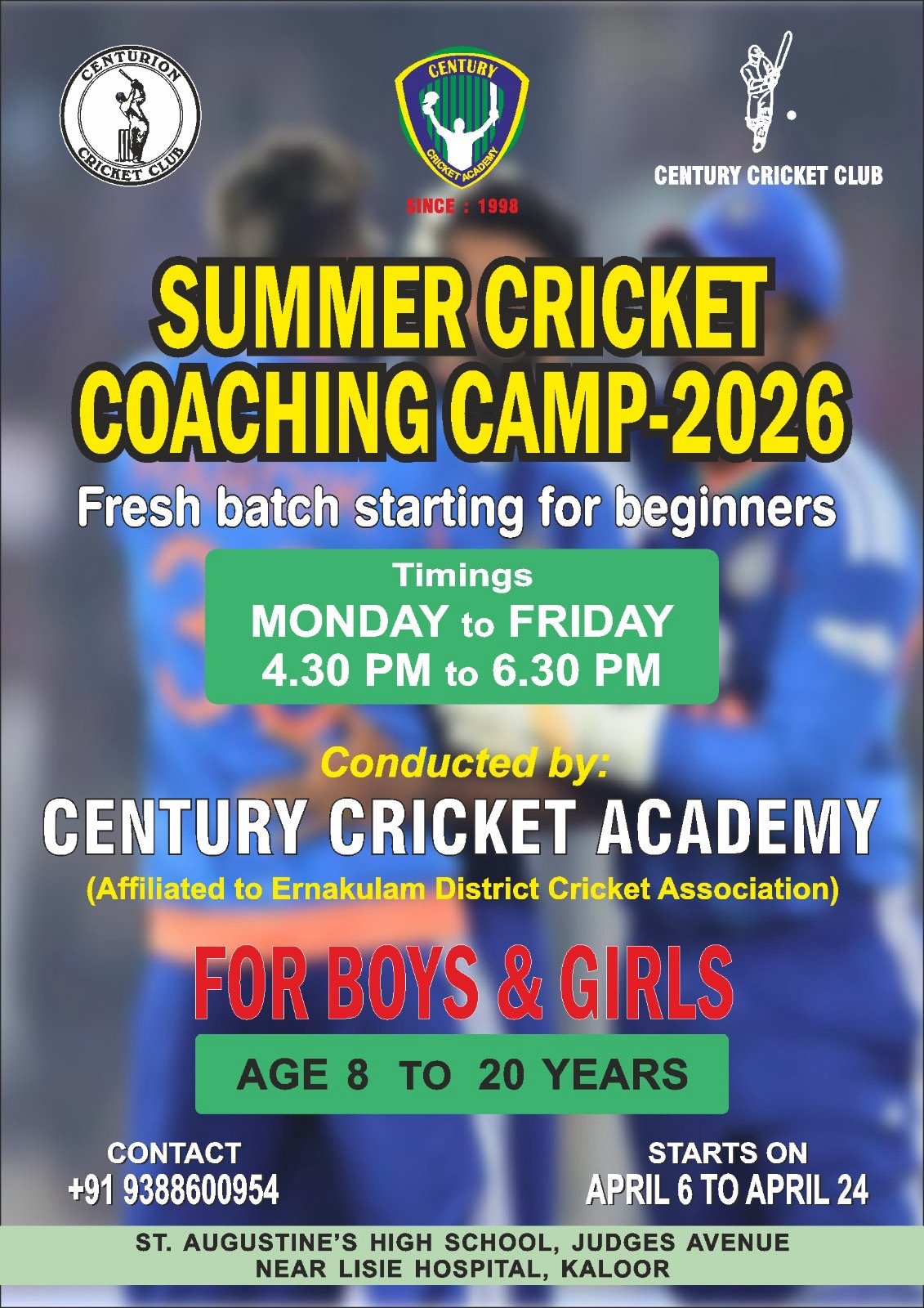 Century Cricket Academy, Cochin was established in the year 1998. Over the years the academy has grown to one of the finest cricketing academies in Kerala. The academy is situated in the heart of the city facing Jawaharlal Nehru International Stadium which has hosted many international cricket matches. Full-fledged practice facility including turf wicket is provided and well qualified coaches are employed to provide best coaching. Ample priority is given to the behaviour of budding cricketers, in and off the field to hold high the glory of this Gentleman’s game. Under the disciplines of the academy, many young cricketers have matured professionally and got representation in state, national and international levels.